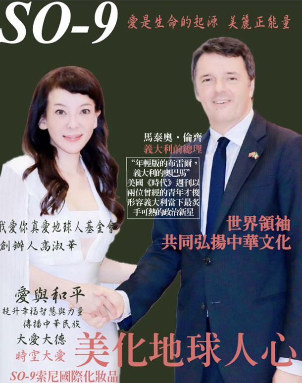 改變全球能量關鍵,締造新世紀的開端,以愛為主核心的偉大企業精神,壯麗雄峙於世界的東方,【SO-9索尼國際化妝品公司】董事長何詠允,【我愛你真愛地球人基金會】創辦人高淑華企業宗旨以愛與良善為公益主軸,近20年來累積百萬客戶愛用者支持推廣,不斷開發新產品,喚醒生物的本能,堅持給女人最好的保養元素,準確地針對全球皮膚進行升級,堅持理念:「帶給人群喜樂的感覺,沒有完美只有更好,希望把每一個人都變成最漂亮的人,更傳遞著一份「愛與善」。