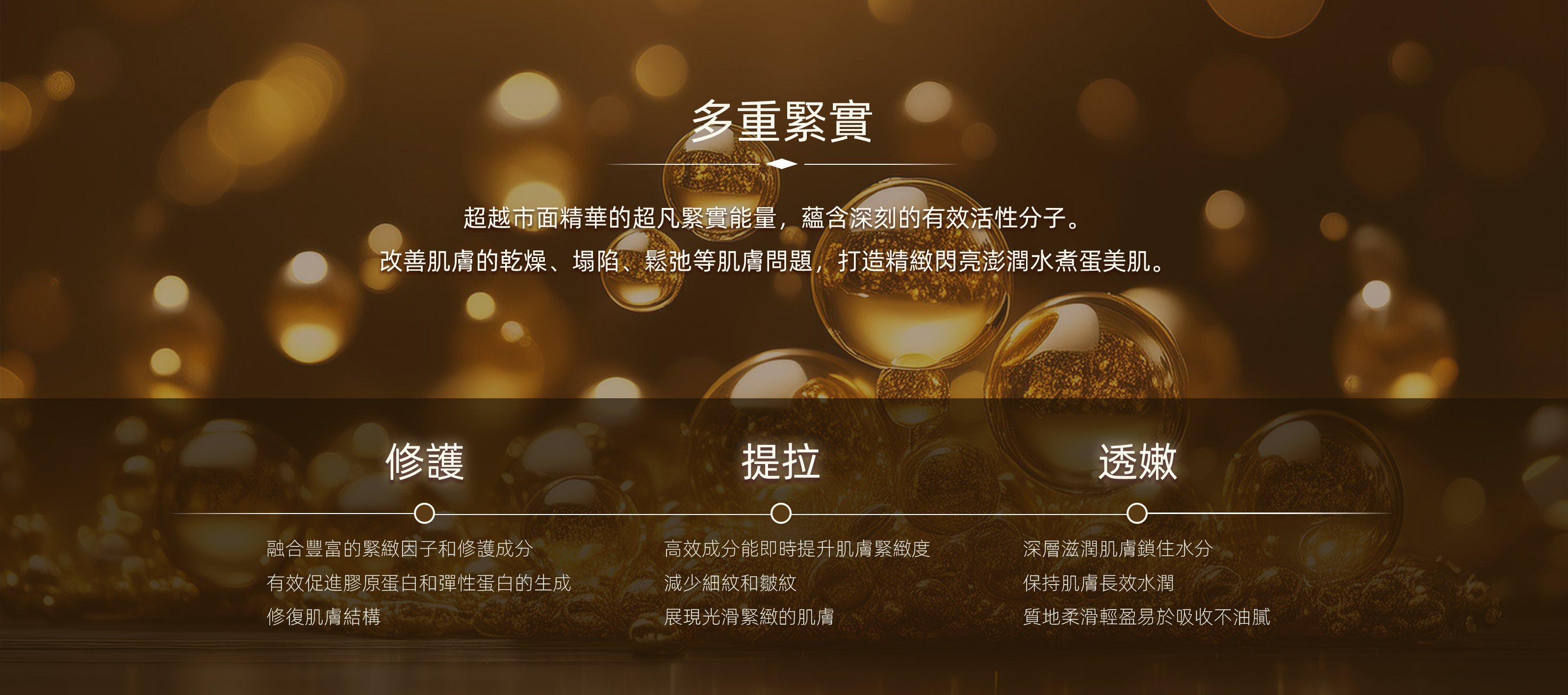 - 深層修護:融合豐富的緊緻因子和修護成分,有效促進膠原蛋白和彈性蛋白的生成,修復肌膚結構。